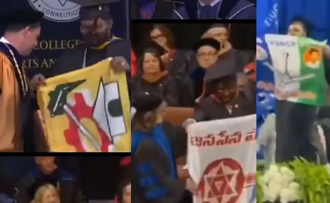 During convocation ceremonies at certain universities, some students are seen holding up banners of political parties like Janasena, TDP, and YCP when their names are called on stage.