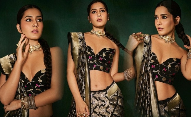 In a black outfit that shows off her flat stomach and reveals her skin in other areas, Raashi fumed with both beauty and erotic appeal, highlighting her elegant femininity.