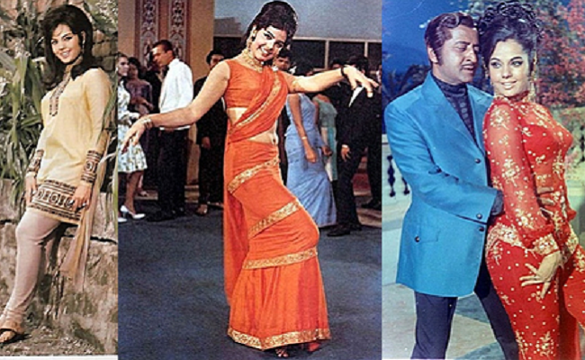 In "Brahmachari", she proved a sari is no bar to shaking a leg with full-on energy as she matched Shammi Kapoor in "Aaj kal tere mere pyaar ke charche", and then went on to show she could exhibit grace too with "Bindiya chamkegi" ("Do Raaste").