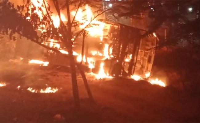 The Volvo bus of a private travel company, which was on its way to Chittoor from Hyderabad, overturned and caught fire. The bus was carrying 40-50 passengers. While almost all passengers jumped out by breaking glass windows, a woman was caught in the flames and was charred to death.